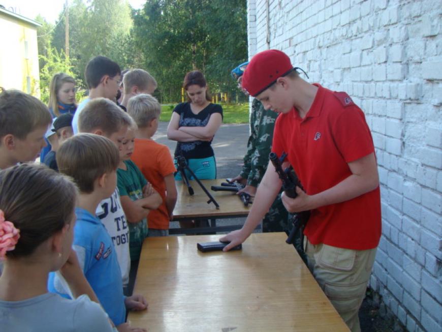 Ветераны и представители движения «Юнармия» познакомили ребят с различными видами стрелкового оружия, потренировали отдыхающих в стрельбе из пневматической винтовки. Начальник штаба юнармейского движения в Карелии Михаил Дийков объяснил ребятам цели и задачи движения, представил им своего воспитанника Евгения Орлова, вернувшегося со службы в ВДВ и подключившегося к работе с детьми. Евгений рассказал ребятам о своей службе и о том, как он к ней готовился, мечтая служить в ВДВ, как его отец.