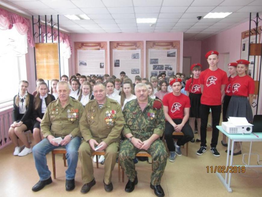 Была показана презентация «15 февраля 1989 года — вывод советских войск из Афганистана». Ветераны рассказали ребятам о боевых буднях, о трудностях службы, о крепкой солдатской дружбе и верности. Они призвали подрастающее поколение учиться мужеству, человечности, дружбе, быть добрым и справедливым к окружающим его людям.