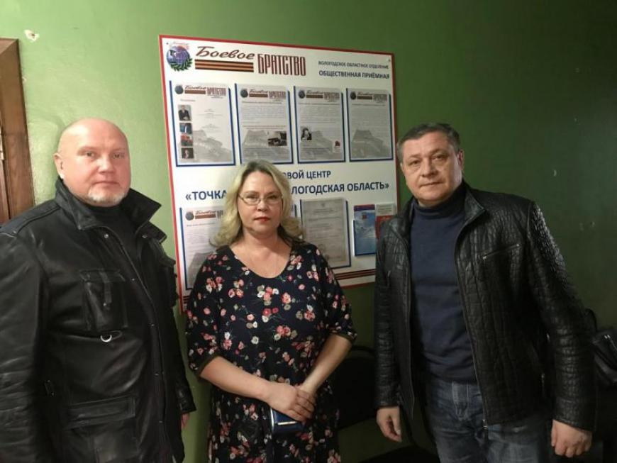 Вологодское районное отделение Всероссийской организации «БОЕВОЕ БРАТСТВО» в рамках реализации проекта «Точка опоры — Вологодская область» при поддержке Фонда президентских грантов и в соответствии с соглашением, заключенным с Вологодским региональным отделением политической партии «Единая Россия», 18 апреля открыло свою общественную приемную на базе приемной партии «Единая Россия». Мероприятие проведено во взаимодействии с секретарем районного отделения партии «Единая Россия» Татьяной Пономаревой.