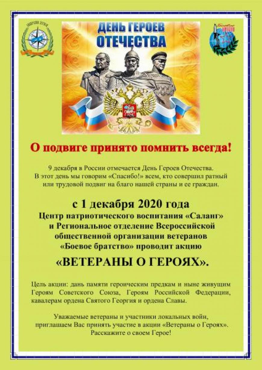 В рамках празднования Дня Героев Отечества региональное отделение Всероссийской общественной организации ветеранов «БОЕВОЕ БРАТСТВО» Ханты-Мансийского автономного округа — Югры совместно с центром патриотического воспитания «Саланг» — центром специальной подготовки «Сибирский легион» города Сургута запустили акцию «Ветераны о Героях».