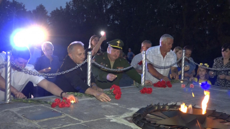 Затем участники мероприятия зажгли свечи и возложили цветы к подножию мемориала у Вечного огня.