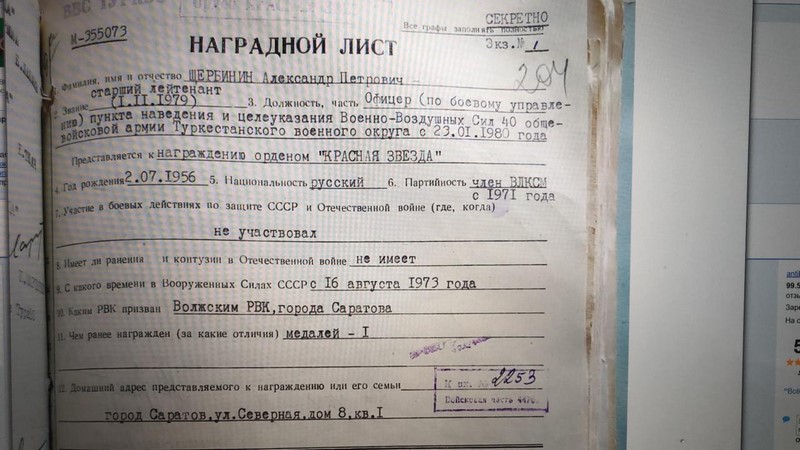 В ходе поисковой работы был установлен информационный контакт с поисковиком, от него были получены документы о награде (выписка из приказа) и фото ордена Красной Звезды с удостоверением на имя Щербинина Александра Петровича. Было установлено что Щербинин служил в Афганистане летчиком и проживал в Саратове.