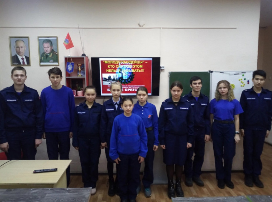 35 юнармейцев с большим вниманием и интересом слушали о подвиге Олега Кошевого, Сергея Тюленина, Ульяны Громовой, Ивана Земнухова, Любови Шевцовой, и Виктора Третьякевича, примеряя на себя их поступки.