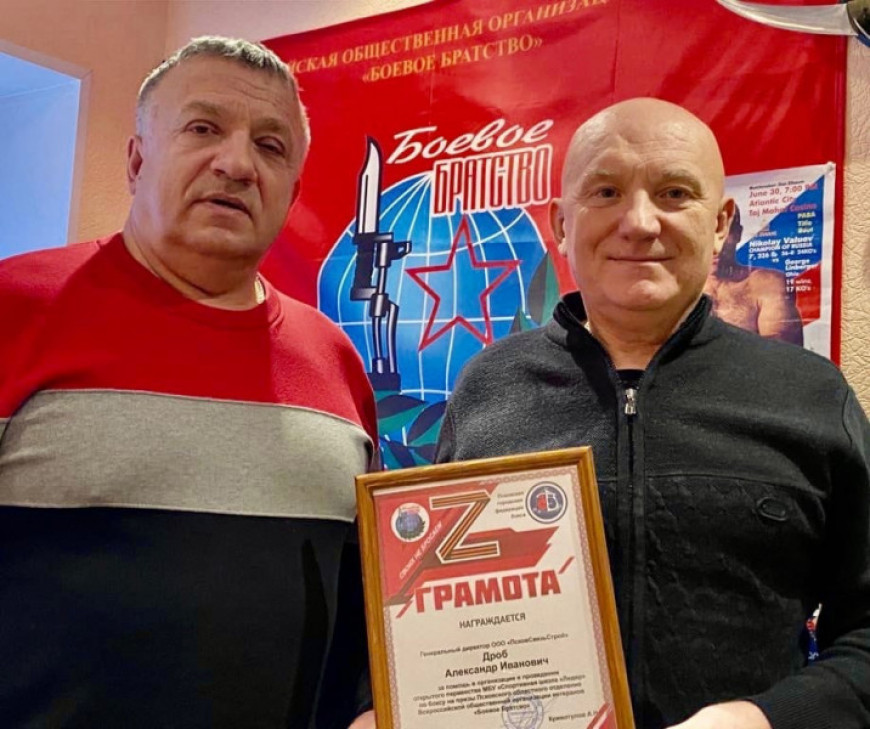 Руководитель Псковского «БОЕВОГО БРАТСТВА« Александр Кривотулов вручил Почетную грамоту за помощь в организации турнира по боксу на призы отделения председателю совета Псковского «БОЕВОГО БРАТСТВА« Александру Дробу.