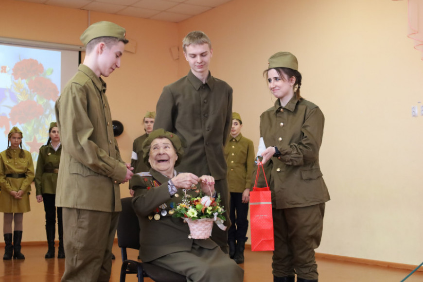 Мария Ивановна Воеводина после представления рассказала ребятам о том, как в 19 лет оказалась на фронте, как выносила раненых солдат с поля боя, как сама чудом не погибла. Несмотря на юный возраст, школьники должны помнить, что в будущем именно им защищать нашу Родину, отметила она.