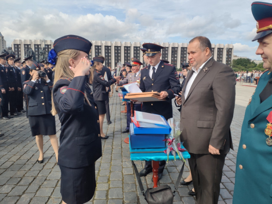 В торжественной церемонии выпуска, которая прошла на территории монумента героическим защитникам Ленинграда, участвовал депутат Законодательного собрания Санкт-Петербурга, член Санкт-Петербургского городского отделения «БОЕВОГО БРАТСТВА» Константин Чебыкин. Он поздравил выпускников с судьбоносным событием в их жизни, вручил им дипломы о высшем образовании и знаки об окончании учебного заведения.
