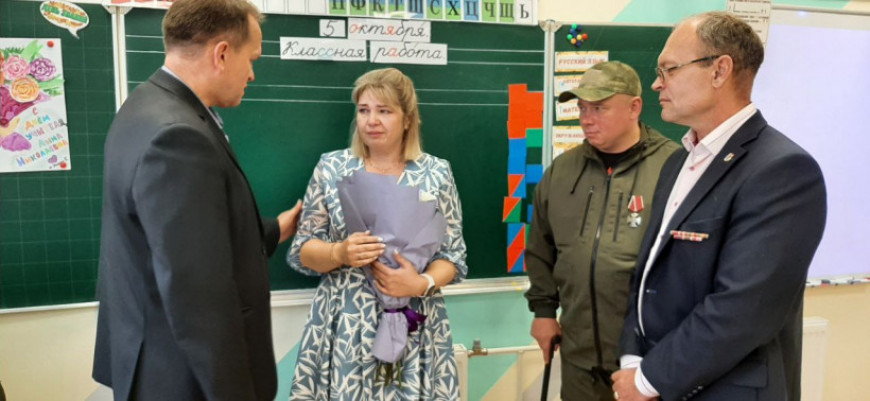 Председатель исполкома отделения, ветеран боевых действий майор запаса Константин Помаскин, Владимир Ворожцов и ветеран СВО Сергей Зыков вручили цветы учителям, чьи мужья и сыновья — ветераны СВО, которые мужественно выполняли и выполняют боевые задачи, защищая Отечество.