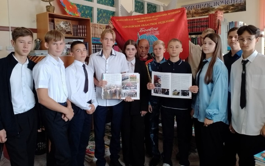 6 сентября член Пугачёвского районного отделения »БОЕВОГО БРАТСТВА» Сергей Кушкарев провел урок мужества в библиотеке школы №13 имени М. В. Ломоносова с учениками 9Б класса, посвященный Дню танкиста.