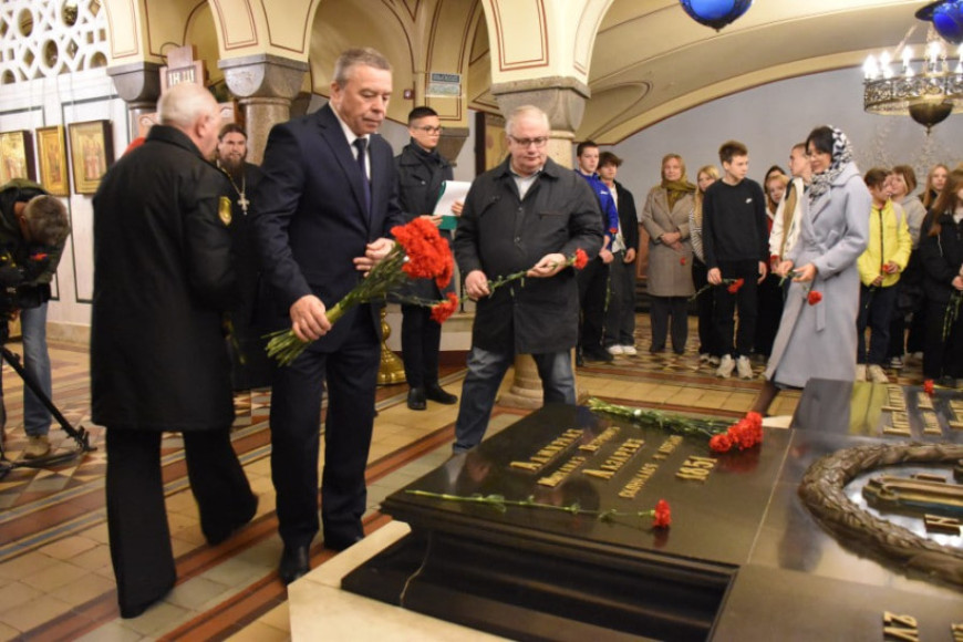 В Свято-Владимирском соборе — усыпальнице адмиралов — участники памятного мероприятия возложили цветы к захоронению Михаила Лазарева.