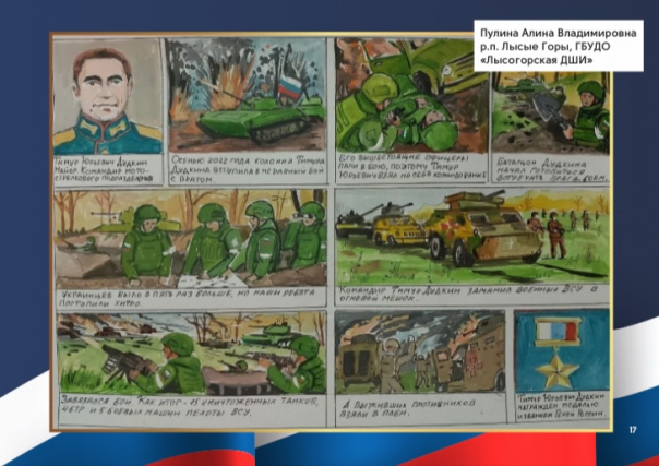 «БОЕВОЕ БРАТСТВО» совместно с «Движением первых», «Волонтерской ротой» при участии молодежных организаций в честь земляков, удостоенных высокого звания Героя России в ходе проведения СВО, провели творческий конкурс в результате которого школьники Саратовской области создали комиксы «Звёзды над Волгой» по мотивам биографий и подвигов героев, в комиксах также рассказывается о подвиге Тимура Дудкина.