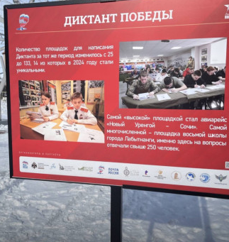 Экспозиция, расположенная в центре города, знакомит с историей, масштабом акции, географией площадок и знаковыми местами проведения диктанта на Ямале.