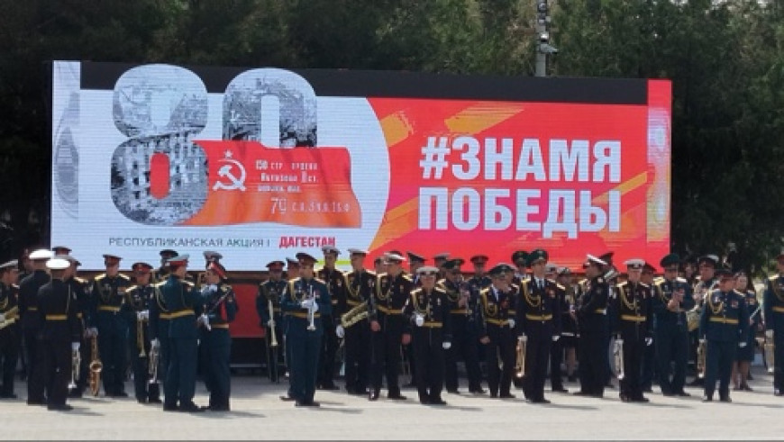 Под звуки песни «День Победы» Знамя Победы подняли на флагшток Герой России Темирлан Абуталимов, председатель Координационного совета ветеранских организаций участников и инвалидов афганских событий, семей погибших Магомед Арипов и ученик 9 класса Махачкалинского многопрофильного лицея № 39 Абдулхаким Исмаилов. Волонтеры развернули на площади масштабную копию Знамени Победы.