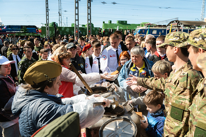 Пассажиры участвовали во всероссийском флэшмобе «Вальс Победы», концертной программе, подготовленной местными творческими коллективами, а также попробовали приготовленную военнослужащими воинских частей Тульского гарнизона солдатскую кашу из полевых кухонь.