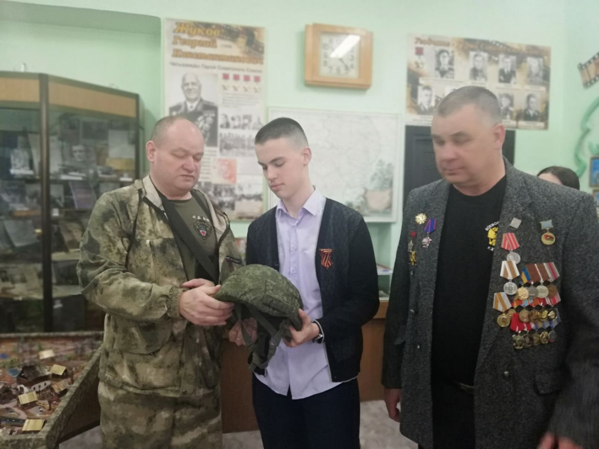 Ветераны выступили перед учащимися 9-х классов, рассказали о своем участии в боевых действиях. Александр Королев передал в музей школы свой шлем, с которым он участвовал в боевых действиях на СВО.