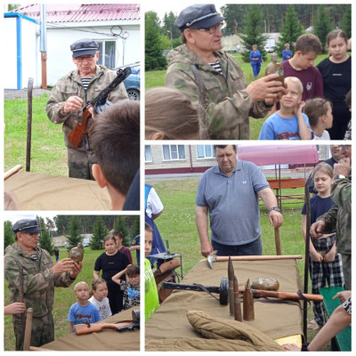 Сергей Есин рассказал о строительстве и строителях Сурского оборонительного рубежа и ознакомил с экспонатами музея-блиндажа. У детей была возможность примерить одежду строителей Сурского рубежа и поработать инструментами: киркой, лопатой, ломом. Сергей Маканин провёл занятия по разборке и сборке автомата АК-74.