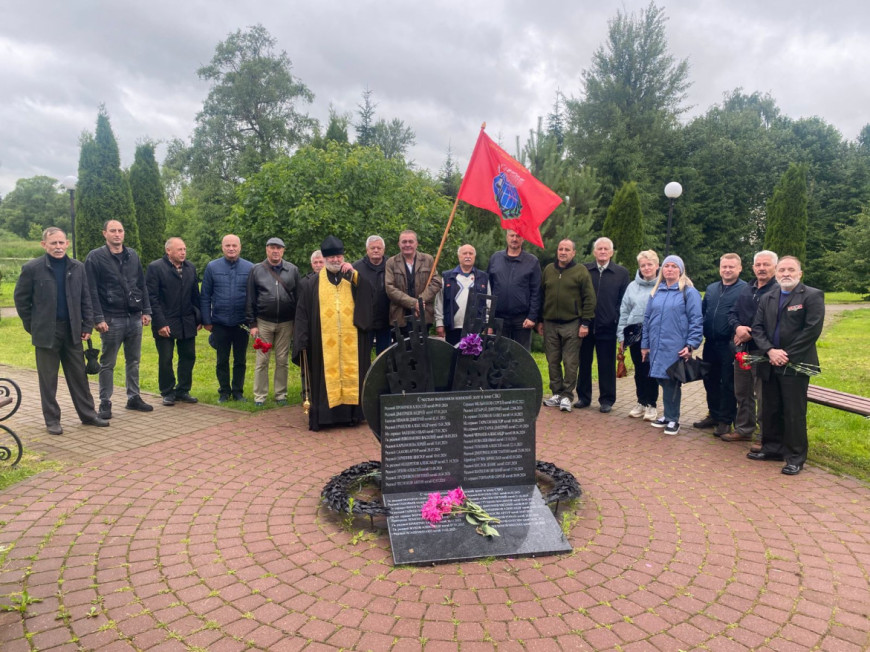 У памятника «Сердце матери» собрались ветераны местного отделения «БОЕВОГО БРАТСТВА» во главе с С. Залозным, ветераны войн в Афганистане и на Северном Кавказе, участники СВО.