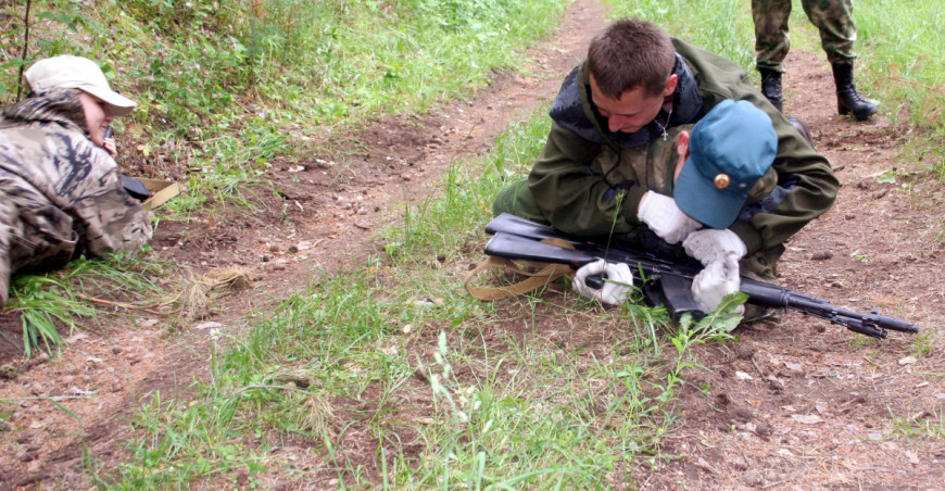 На лесной полосе препятствий будущие спасатели отрабатывали навыки, необходимые для работы в экстремальных условиях: преодоление заболоченных участков, переправу по бревну, маскировку, метание гранат, оказание первой помощи «раненым» и стрельбу из МР-654.