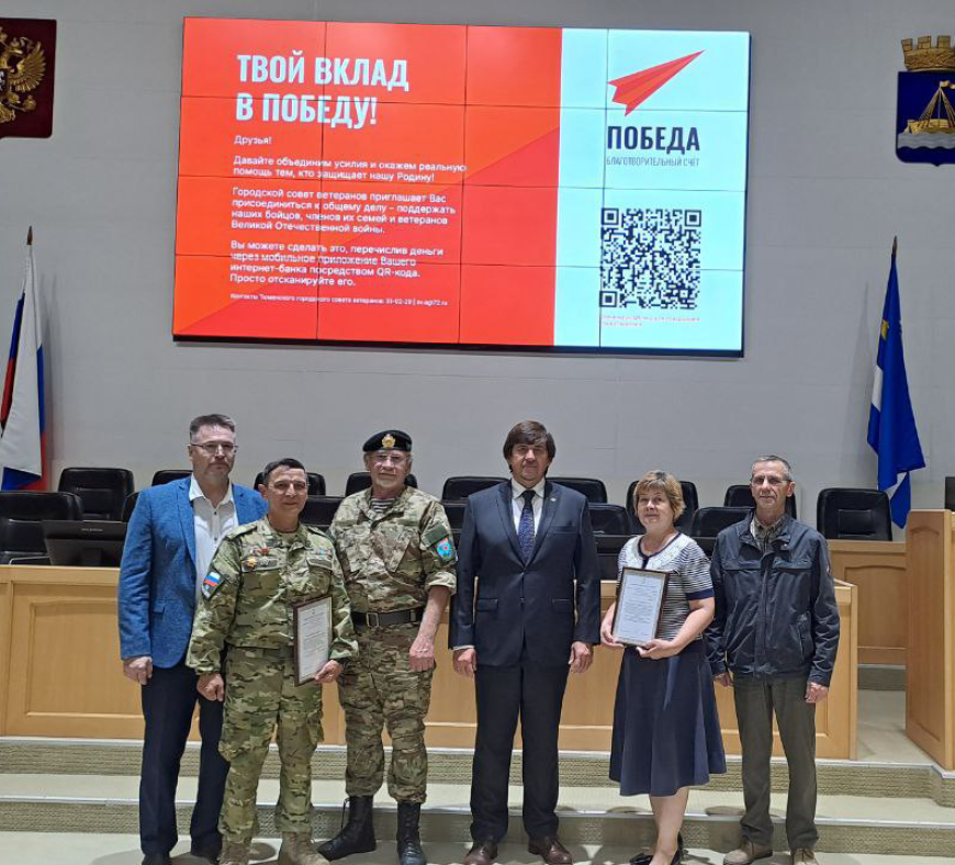 Мэр Тюмени Максим Афанасьев наградил благодарственными письмами волонтерские группы «БОЕВОГО БРАТСТВА»: «Брат Z», руководитель и создатель которого – начальник штаба «БОЕВОГО БРАТСТВА» в Тюмени Явгар Янгиров, и коллектив под руководством Натальи Мелкобродовой «Сестри4ки72» - Ольгу Старцеву, Татьяну Самойлову, Татьяну Шумко, Светлану Горельчик и Любовь Железнову.
