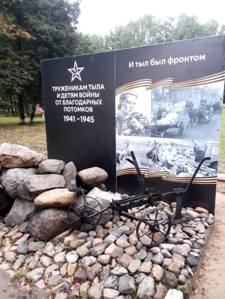 В него входят три объекта: сам памятник, плуг и другие сельские приспособления того времени, а также стела со стихотворением, посвящённым военному тылу.