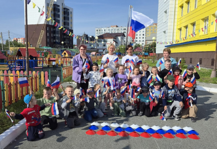 На территории детского сада «Ромашка» в Салехарде с ребятами были проведены патриотические игры, спортивные эстафеты и флешмоб с использованием цветов триколора.