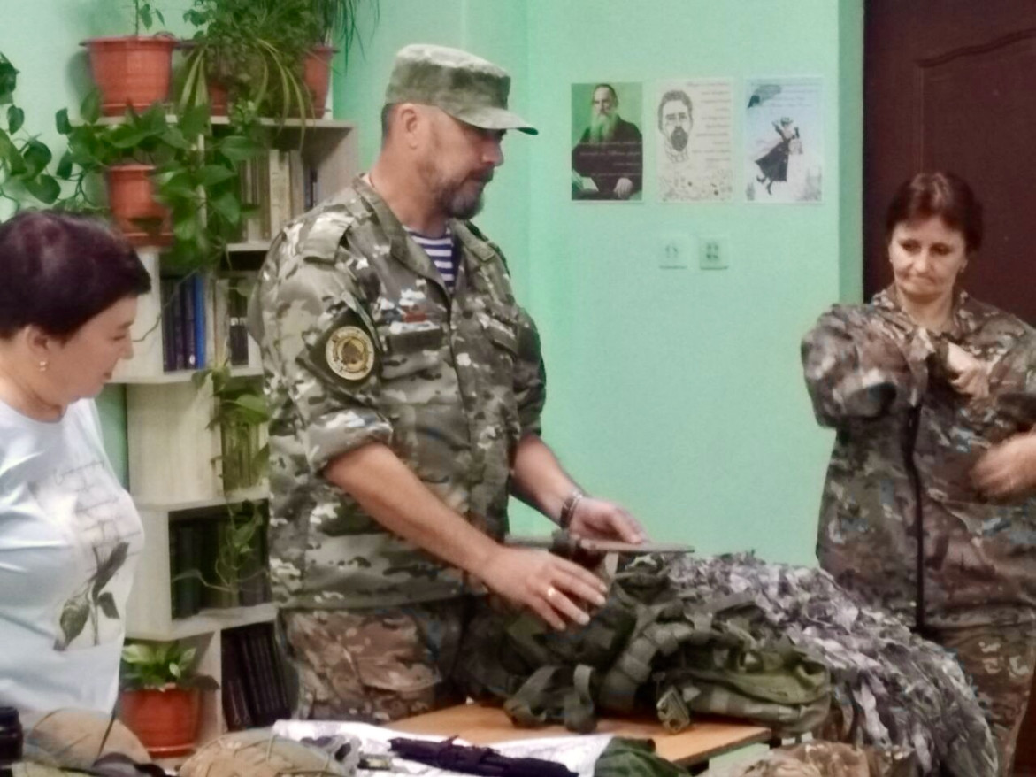 Иван Силантьев поделился боевым опытом, рассказывал о долге, чести, отваге, силе духа и любви к Родине. Ребята также смогли примерить бронежилет и костюм “Леший”.