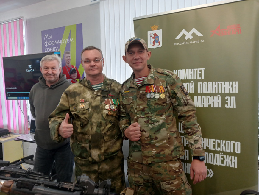 Ветераны «БОЕВОГО БРАТСТВА» Сергей Торбеев, Дмитрий Дубников, Владислав Белоглазов, которые представили выставку огнестрельного оружия стрелковых подразделений и БПЛА.