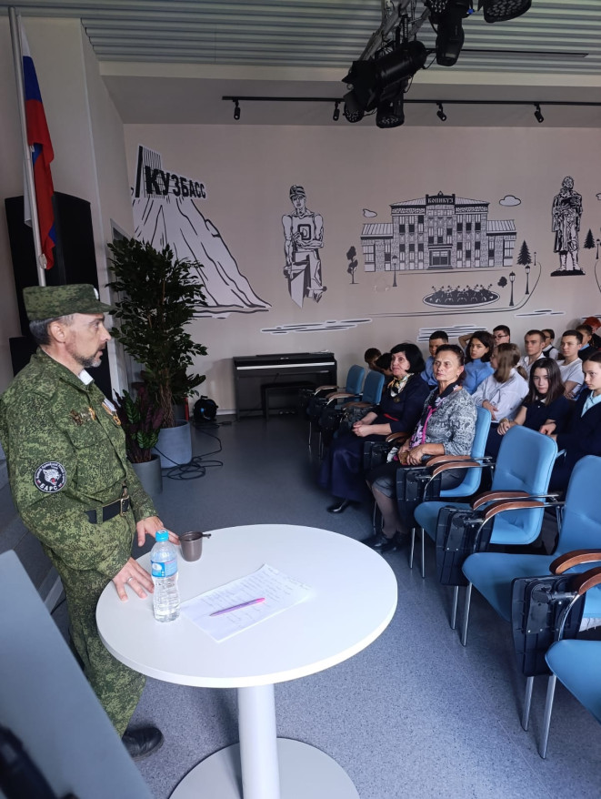 Перед школьниками выступил Владимир Карпенко — ветеран боевых действий, участник второй чеченской кампании и Специальной военной операции, член Союза добровольцев Донбасса и представитель Беловского «БОЕВОГО БРАТСТВА». Он поделился с ребятами опытом и рассказал о том, как адаптировался к мирной жизни после службы.