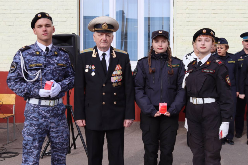 Председатель Калужского городского отделения «БОЕВОГО БРАТСТВА» подполковник в отставке Игорь Серегин обратился с патриотической речью к студентам, их родственникам, педагогическому коллективу, представителям силовых структур города Калуги. От ветеранской организации он вручил трем лучшим кадетам третьего курса медали «За особые успехи в кадетском образовании».