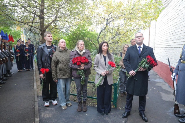 Участники мероприятия почтили память участника СВО и возложили цветы к мемориалу. Открытие доски завершилось прохождением знаменного взвода торжественным маршем.