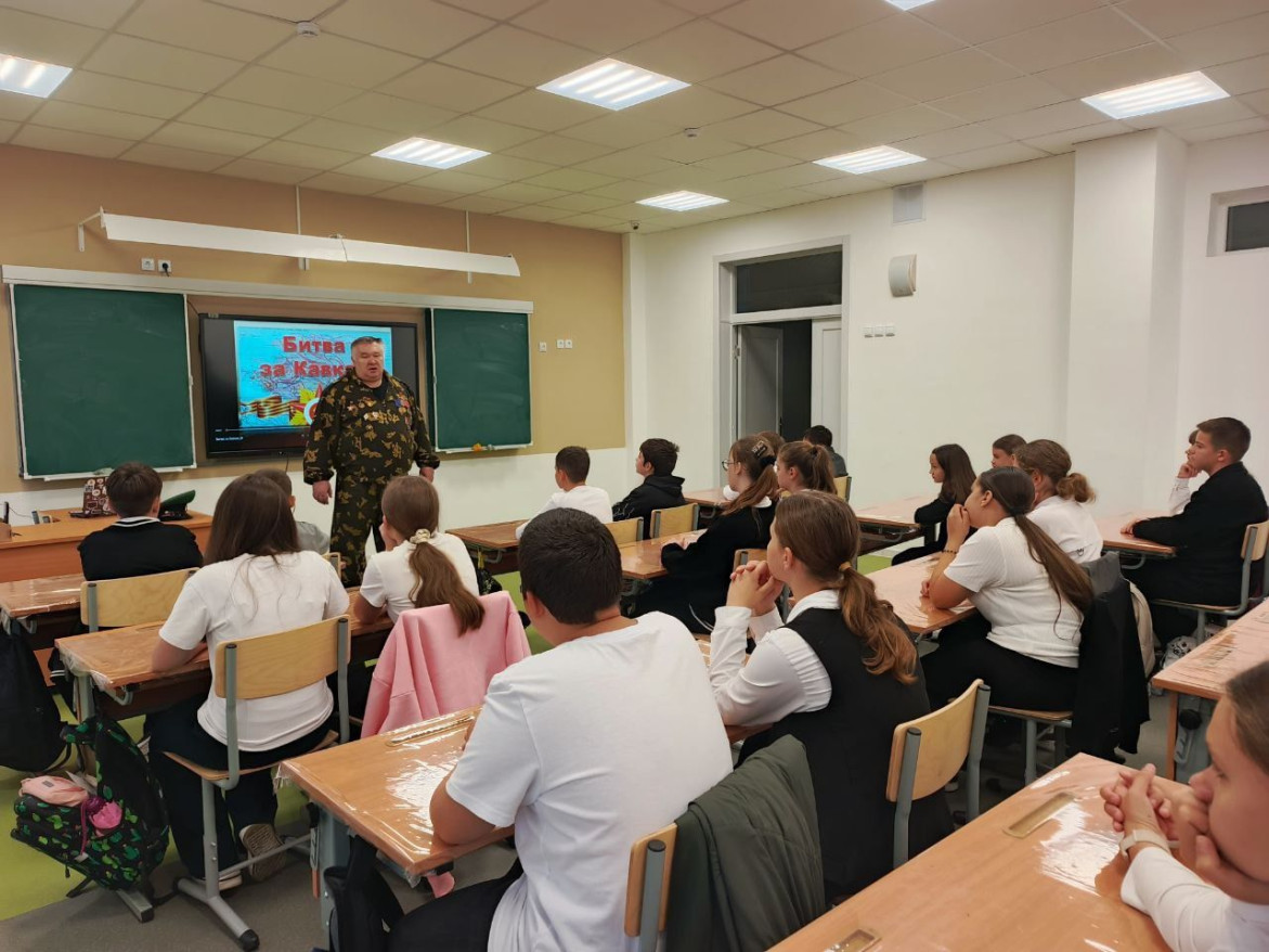 “Битва за Кавказ длилась 442 дня и стала самой продолжительной в годы войны и закончилась 9 октября 1943 года победой советских войск, которые в упорных и кровопролитных боях освобождали оккупированную территорию нашей страны. Учащимся показан учебный фильм, рассказывающий о героизме наших солдат”, — сказал Игорь Кубанов.