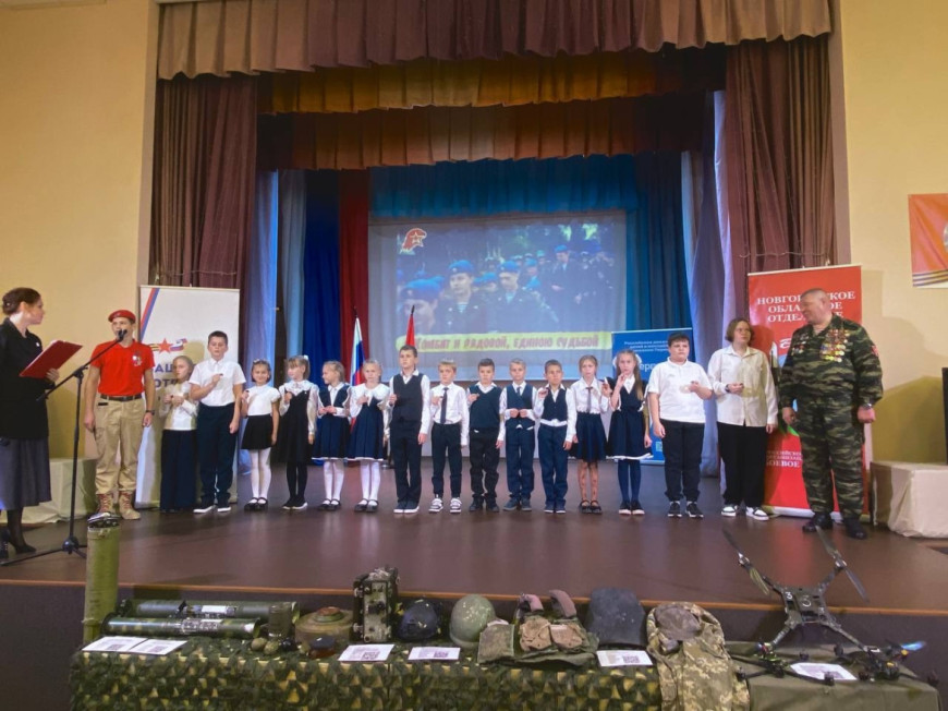 В зале была организована передвижная выставка артефактов специальной военной операции Дома молодёжи Новгородского муниципального округа. Участники мероприятия с интересом изучали представленные экспонаты.