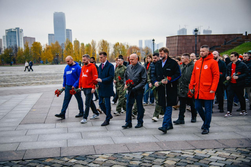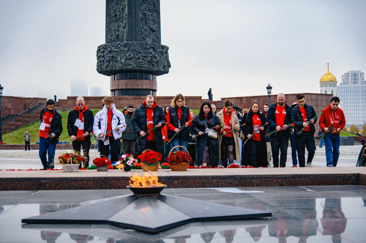 Представители Московского отделения «БОЕВОГО БРАТСТВА» и участники форума «Волонтёрской роты» возложили цветы к Вечному огню и растянули масштабную ленту-триколор 25х50 метров.