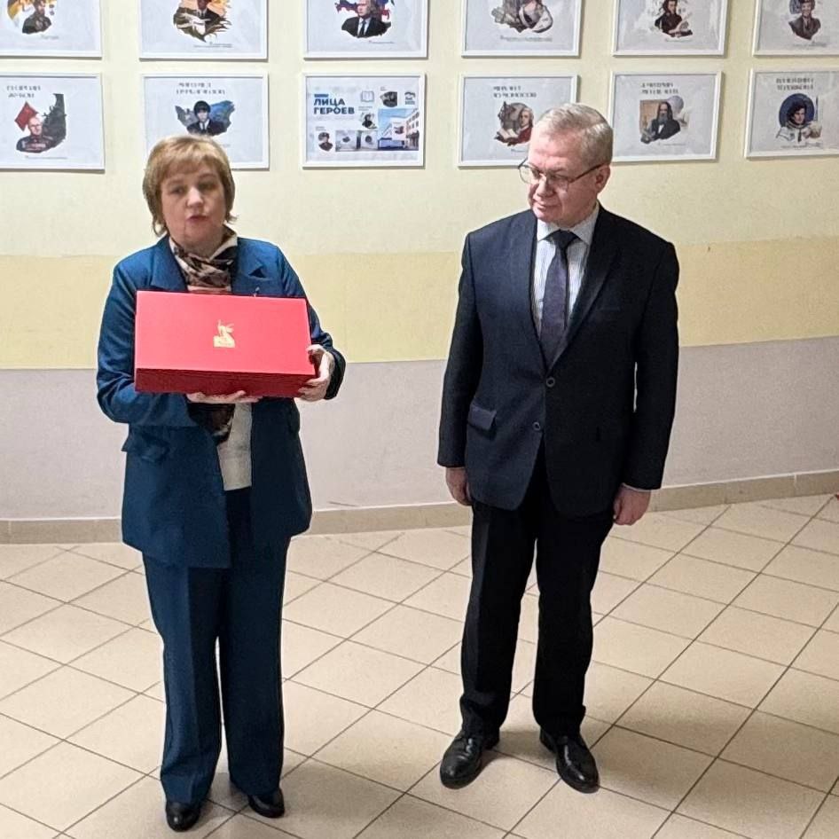 Глава муниципального округа Раменки Станислав Дмитриев вместе с директором школы Верой Владимировной Неретиной перерезали красную ленту у выставочной экспозиции «Лица героев».