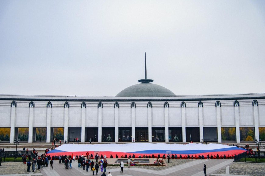 Участники форума развернули огромный флаг Российской Федерации на площадке близ Музея Победы.