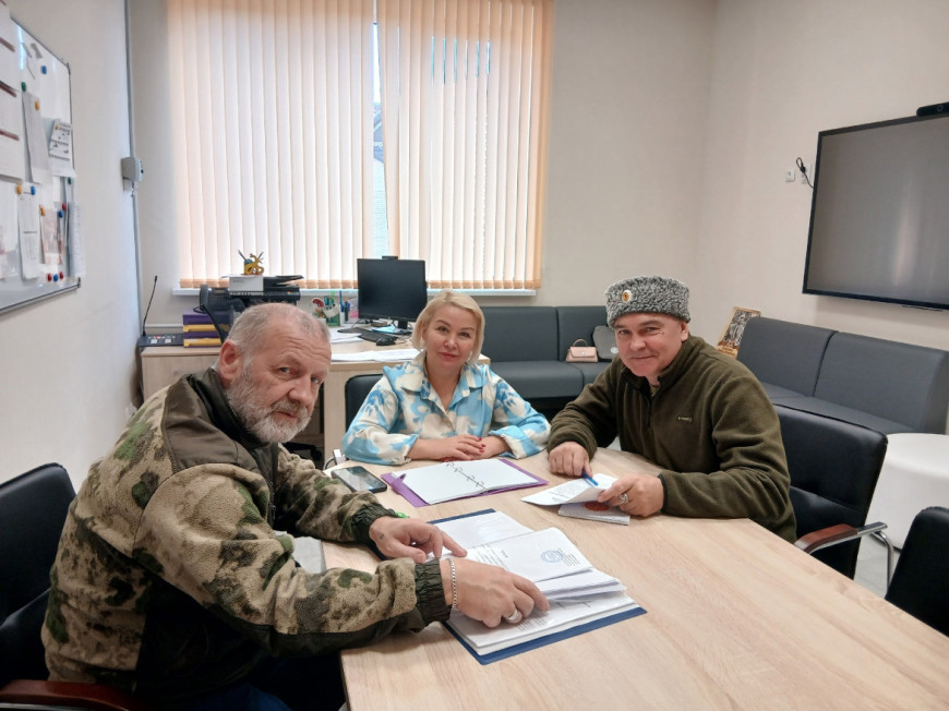 Встретились походный атаман хутора Покровский Волжского района Алексаандр Глухов, директор школы № 32 Наталья Пушкина и заместитель директора, наставник казачьего класса, подъесаул, ветеран СВО Андрей Фещуков.