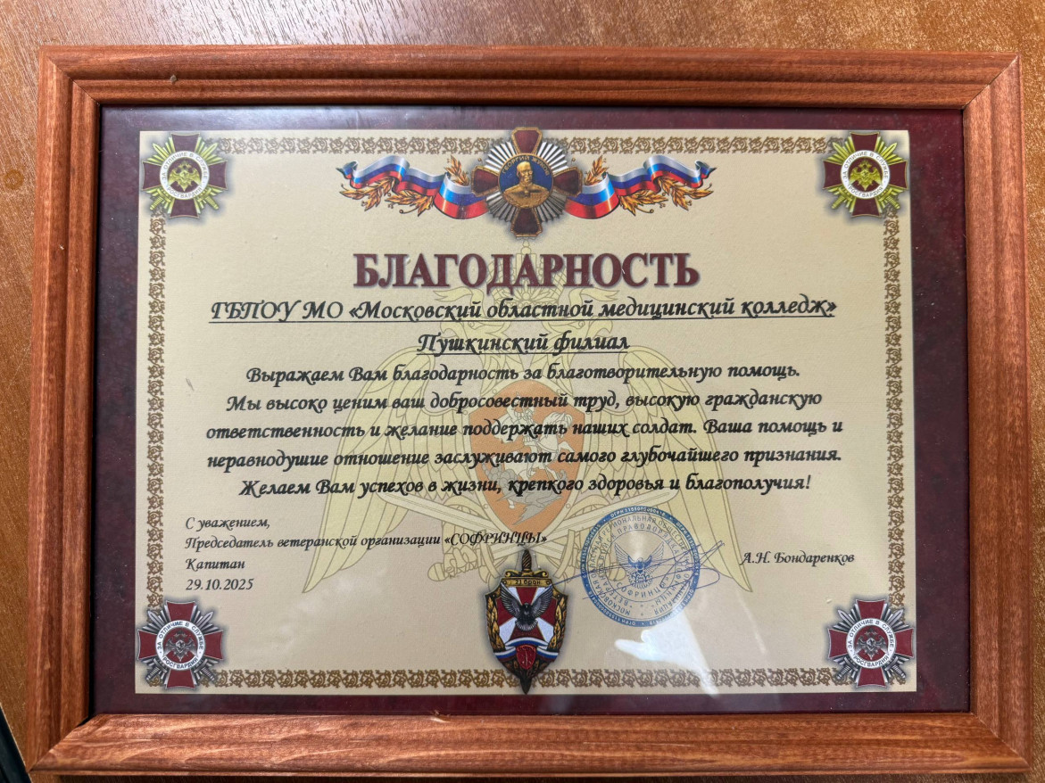 1 ноября руководитель Пушкинского отделения «БОЕВОГО БРАТСТВА» Сергей Борисов от Совета ветеранов «Софринцы» вручил благодарность Пушкинскому филиалу Московского областного медицинского колледжа за оказанную помощь бойцам Софринской бригады.