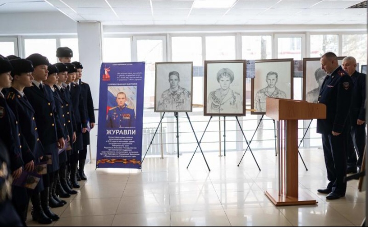 Мероприятие состоялось в день памяти сотрудников органов внутренних дел, погибших при выполнении служебного долга в зоне Спецоперации. Алексей Авдеев рассказал о некоторых погибших, изображенных на портретах.