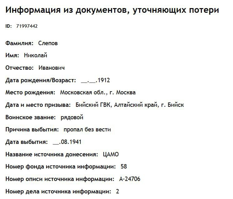 Опознанным оказался Слепов Николай Иванович, 1912 года рождения, считавшийся без вести пропавшим.