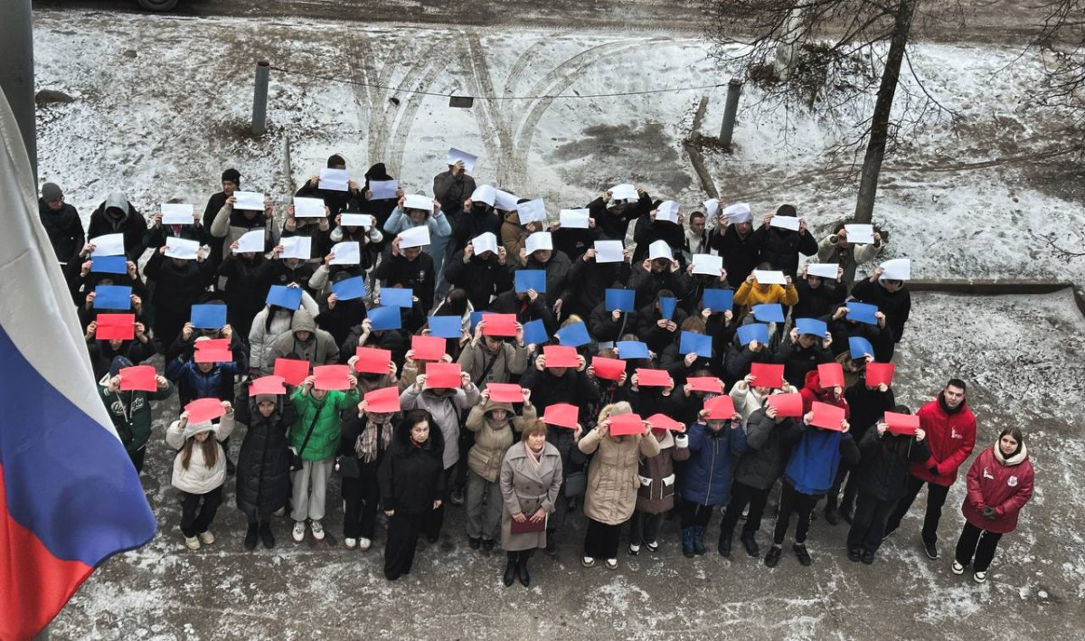 80 учащихся техникума выстроились в виде флага России, подняв над головой белые, синие и красные листы. Ко всем присутствующим с напутственным словом обратилась депутат Костромской областной думы Татьяна Быстрякова.