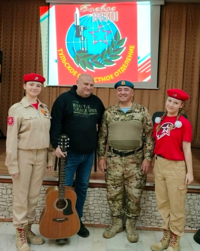 Затем для учеников школы, членов «Движения первых» и юнармейцев города состоялся авторский концерт заместителя руководителя тульского областного «БОЕВОГО БРАТСТВА» Андрея Никольского, поэта и композитора.