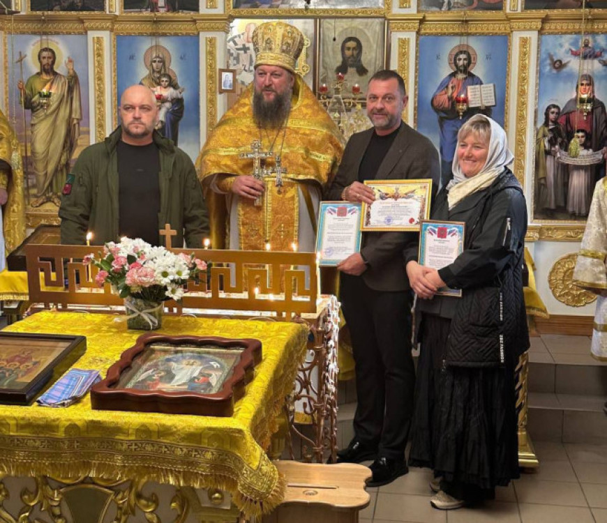 22 ноября в храме святого великомученика Георгия Победоносца руководитель Запорожского областного отделения Виктор Рязанцев вручил благодарственные письма от командиров ряда воинских подразделений Министерства обороны России прихожанам храма Наталье Антроповой и Денису Василенко за их активное участие в гуманитарных акциях.