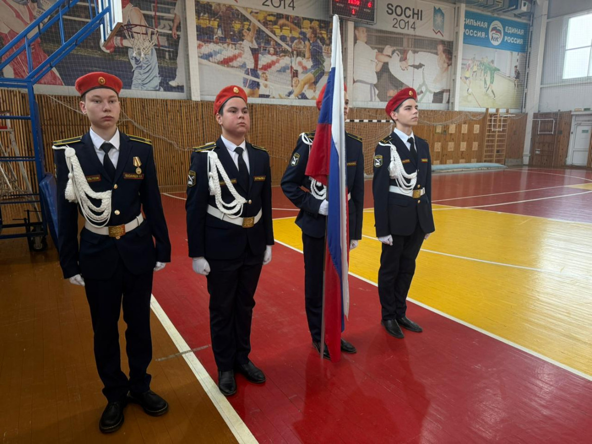 Внесли знамя РФ в спортзал кадеты школы № 1 Ковылкина. Прозвучал гимн РФ. Минутой молчания почтили память Валерия Миточкина.