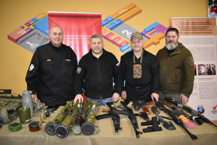 Ветераны из Новодвинска организовали выставку современного и исторического оружия, включая винтовку Мосина, ППШ, наган, пулемет Дегтярева, АК-47, а также военное обмундирование. Посетители могли осмотреть и разобрать оружие, примерить шлем и бронежилет.
