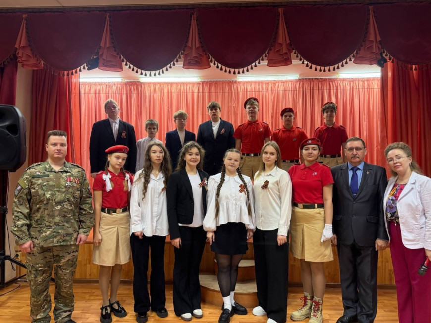 После урока мужества руководитель Егорьевского отделения Сывороткин Сергей наградил команду «Аврора» (Запорощенко Артём, Дерачиц Ксения, Богдан Станислав, Байджаева Екатерина) за активное участие в региональных военно-патриотических играх в 2025 году.