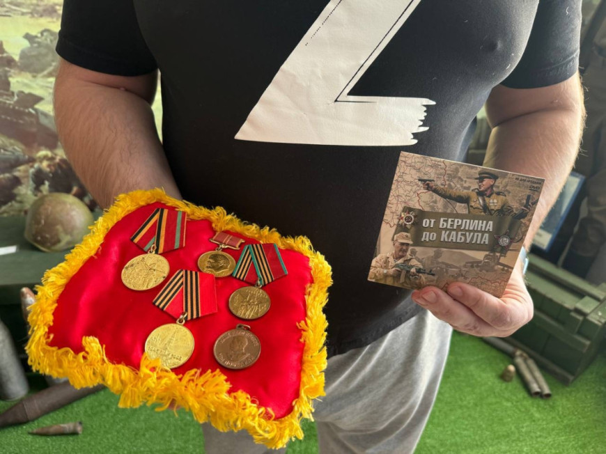 Член Сызранского «БОЕВОГО БРАТСТВА» Сергей Иванов передал медали участника Великой Отечественной войны и диск «От Берлина до Кабула» самарского военно-исторического клуба «Патриоты».