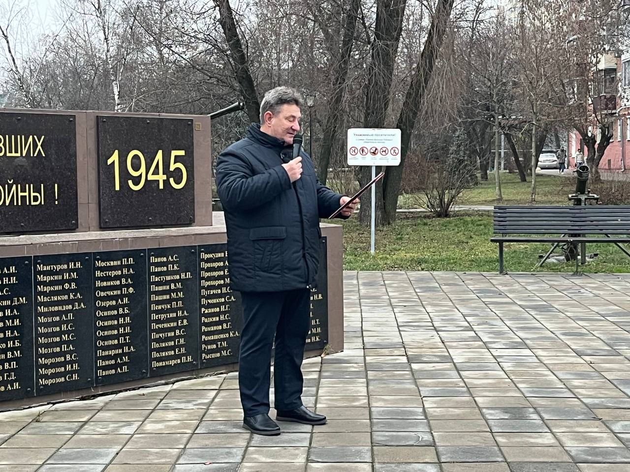 Руководитель Щербинского районного отделения “БОЕВОГО БРАТСТВА” Владимир Ивановский зачитал памятный адрес Героя России, Депутата Государственной Думы ФС РФ, первого заместителя председателя Всероссийской организации “БОЕВОЕ БРАТСТВО” Дмитрия Саблина в честь дня начала контрнаступления Советских войск против немецко-фашистских войск в битве под Москвой.