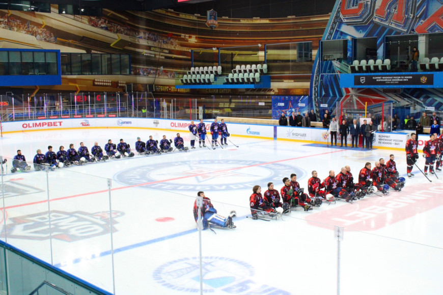 В матче встретились команды «Запад» и «Восток», составленные из следж-хоккеистов и игроков в классический хоккей.