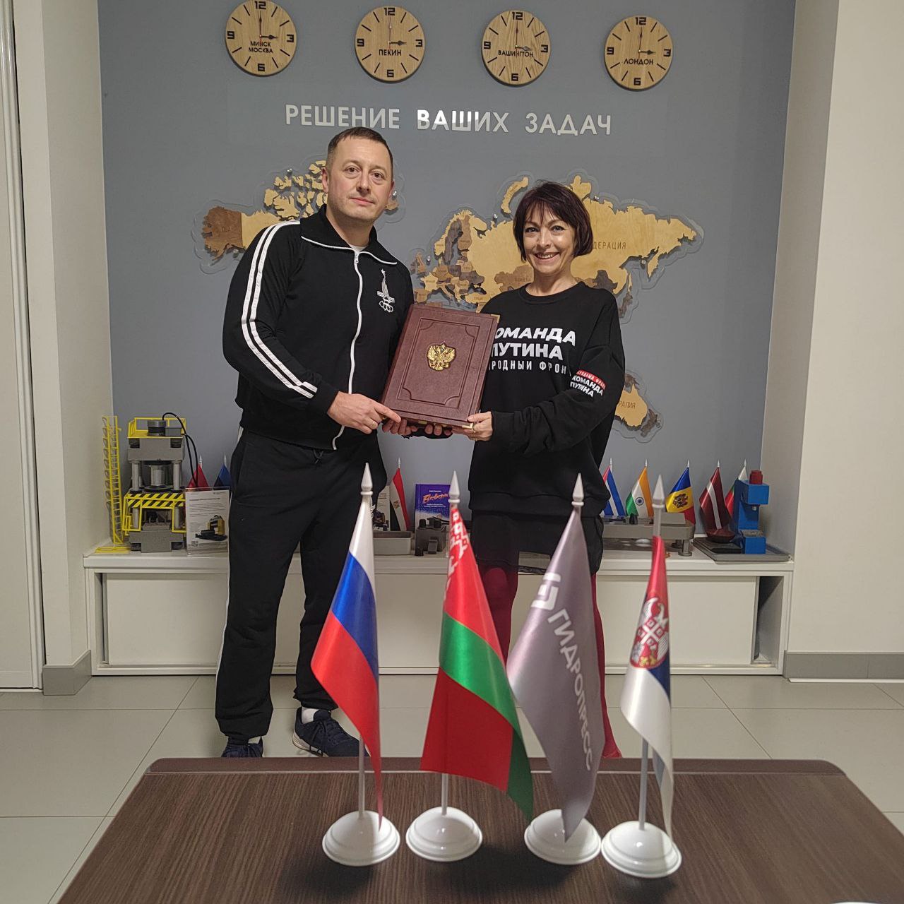 За активное развитие международных отношений и большое внимание, уделяемое вовлечению ветеранов в воспитание подрастающего поколения Ольге Литвиной вручили книгу политолога Сергея Перевезенцева “Россия - великая судьба”.