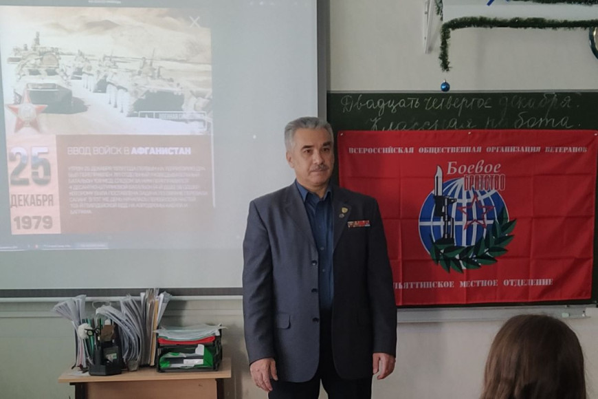 24 декабря член Тольяттинского местного отделения «БОЕВОГО БРАТСТВА» воин-интернационалист Ергашев Юрий провел урок мужества с учащимися 9Г класса лицея №57, посвященный Дню ввода 40-й армии в республику Афганистан.