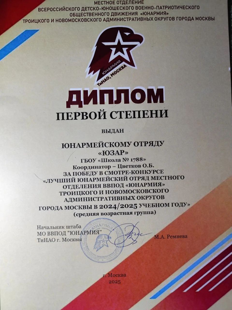 17 декабря в Москве на итоговом мероприятии отделения «Юнармии» ТиНАО были подведены результаты года. Юнармейский отряд «Юзар» школы №1788 признан лучшим в средней возрастной группе.